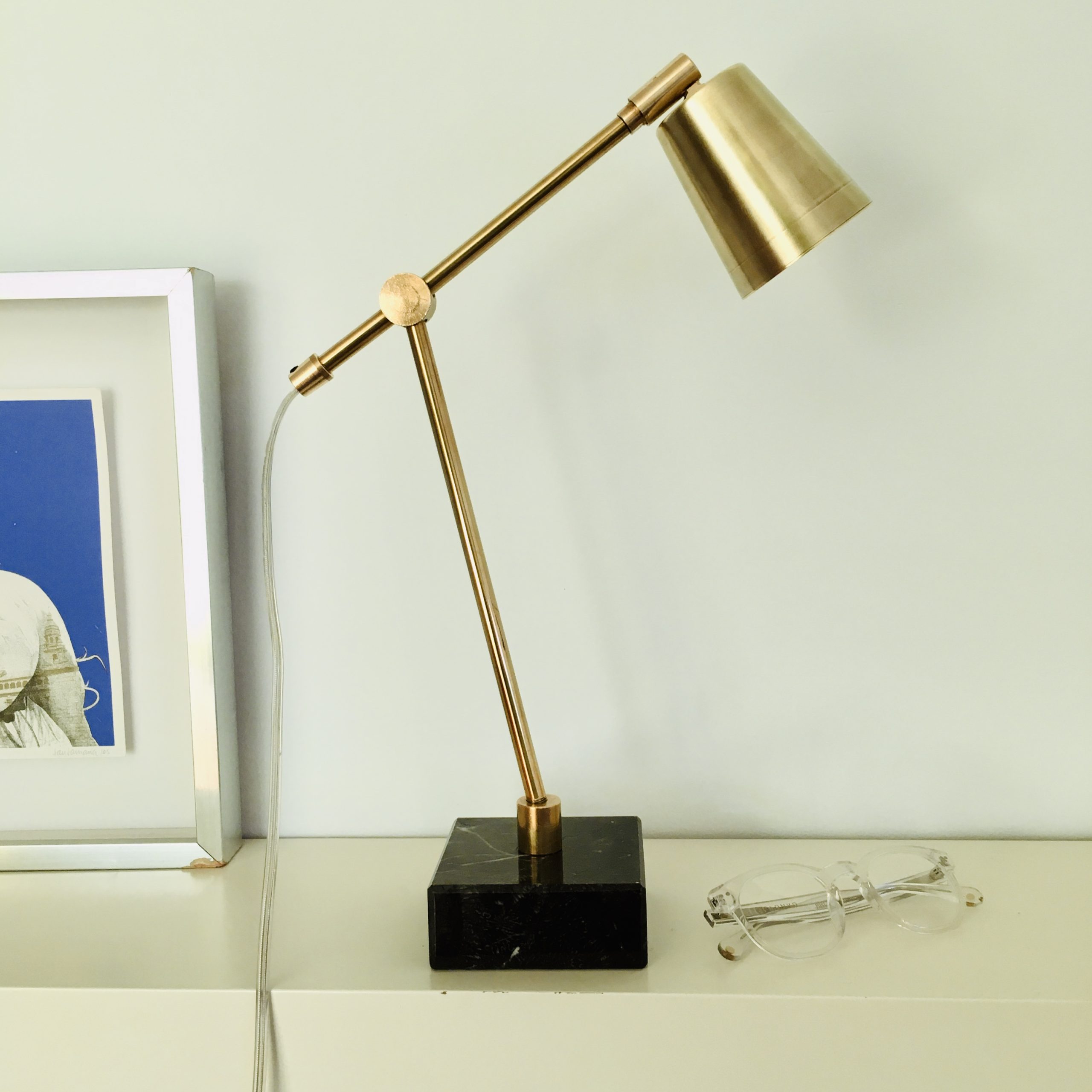 Lámpara de mesa en latón, con rótula orientable. Base mármol negro de 10x10cm.