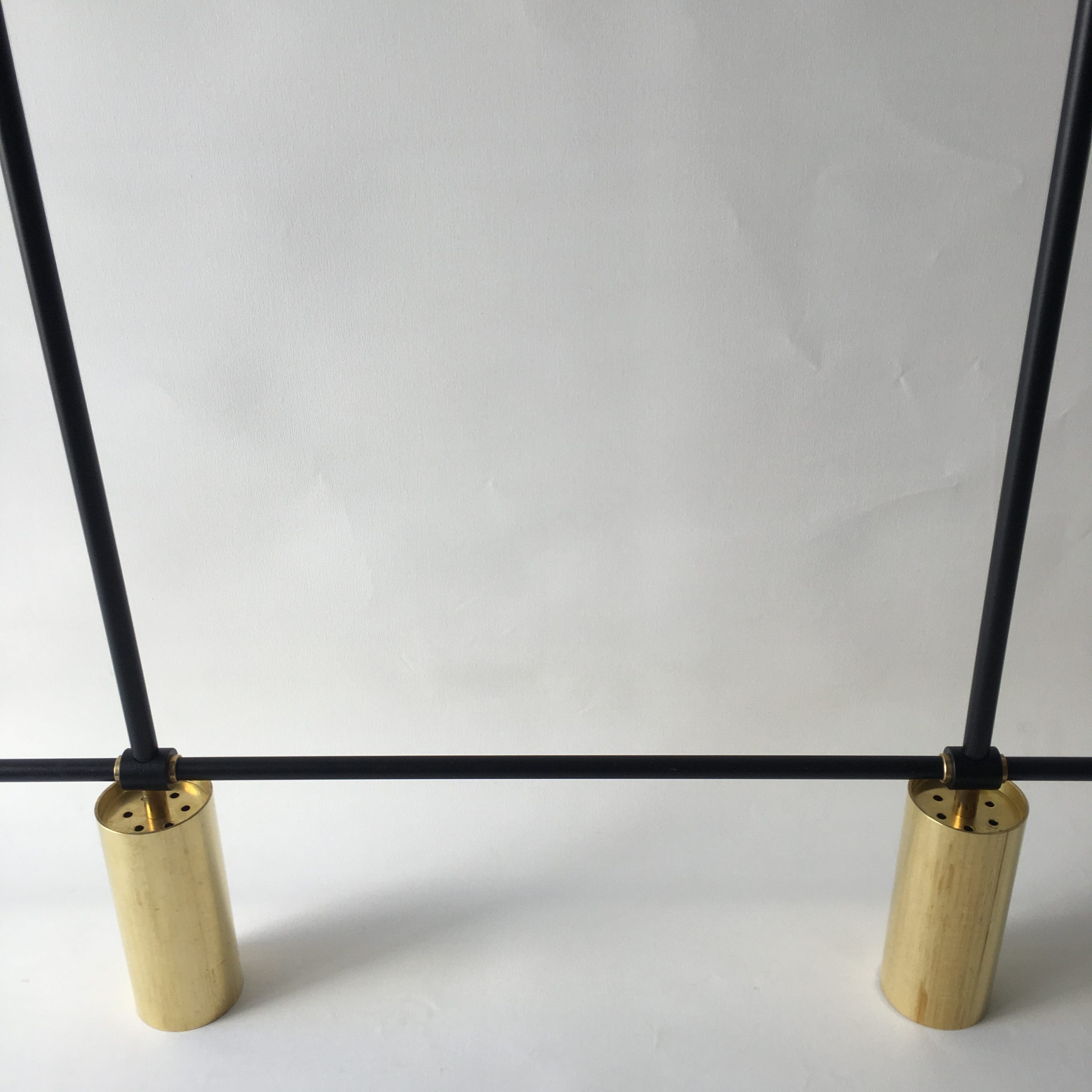 Lámpara de techo en negro y latón. De la regleta de 60 cm. que va en el techo se suspenden dos ejes que sujetan 4 focos de latón. La altura se puede elegir, en la foto la altura total son 110 cm. pero para techos de 250 cm la altura son 90 cm. Los focos son roscables por lo que el cambio de bombilla resulta fácil. Es una gran lámpara y al mismo tiempo liviana, con peso reducido. El resultado es siempre elegante y funcional. También es posible hacerla toda en latón.